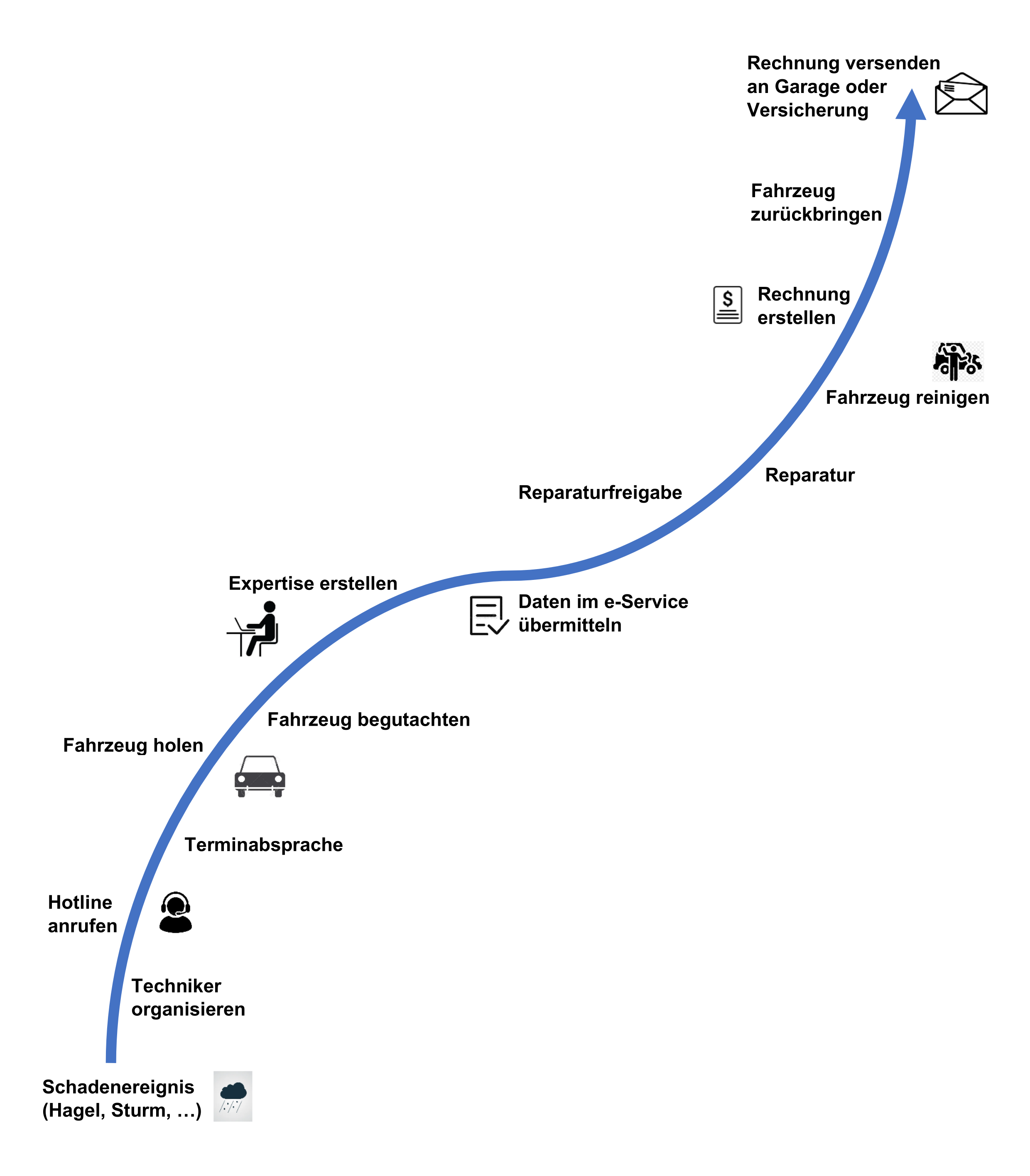 - Schaden begutachten, Drücker-Rapport erstellen, Hagelreparatur vor Ort, beim Garagisten (je nach Kapazität) oder am Firmensitz der Hailtec GmbH, Garagenbetrieb übernimmt die De-/Montagearbeiten, Ersatzteilbestellungen und die Rechnungsstellung an die Versicherung