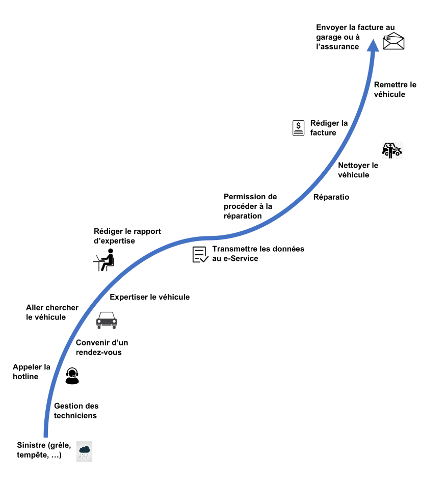 - Service de récupération et de livraison du véhicule, expertise des dégâts et réparation au siège de Hailtec GmbH, Hailtec prend en charge les travaux de démontage et de montage ainsi que la remise de l’estimation des coûts et photos à l’assurance (via e-Service), le garage se charge des commandes des pièces de rechange et de la facturation à l’assurance